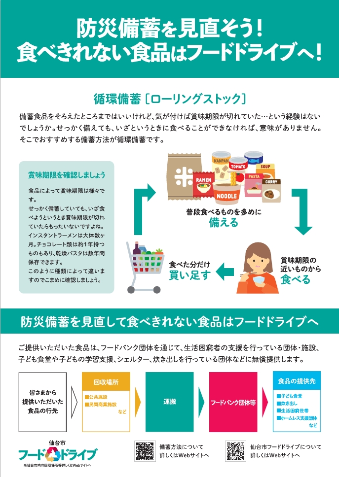対象となる食品は、常温保存可能で賞味期限まで1ヵ月以上あるお米や缶詰、インスタント麺、乾麺、レトルト食品など(生鮮食品不可)。家庭や職場に眠っているまだ食べられる食品がありましたらぜひご協力ください。回収場所など詳しくは「ワケルネット」をご覧ください。 ◆循環備蓄「ローリングストック」を意識しよう 防災のために備蓄食品をそろえたところまではいいけれど、気が付けば賞味期限が切れていたという経験はありませんか?せっかく備えても、いざというときに食べることができなければ意味がありません。そこでオススメなのが循環備蓄です。 仙台市ホームページ:http://www.city.sendai.jp/haiki-shido/faq/gominodashikata/dashikata/095.html 【お問い合わせ】 環境局家庭ごみ減量課(仙台市青葉区二日町6-12二日町第二仮庁舎3階) 電話番号:022-214-8229/ファクス:022-214-8277